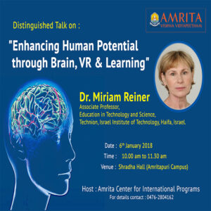 The aim of Dr. Miriam’s visit to Amrita Vishwa Vidyapeetham was to promote inter-university cooperation and networking to enhance institutional capacities through knowledge sharing and collaborative work. To this end, she also presented a seminar to staff and faculty pertaining to the neurosciences, artificial reality, and how the combination of these two can be used to enhance learning dynamics, and to shift specific problematic social challenges. Dr. Miriam first met with key members at Amrita and had group discussions with the AMMACHI Labs Technologies Group at the 2nd Foundation Makerspace. Following this meeting, she presented a seminar titled “Enhancing human performance- Integrating virtual and augmented reality with physiological measures to study cognitive-affective responses.”