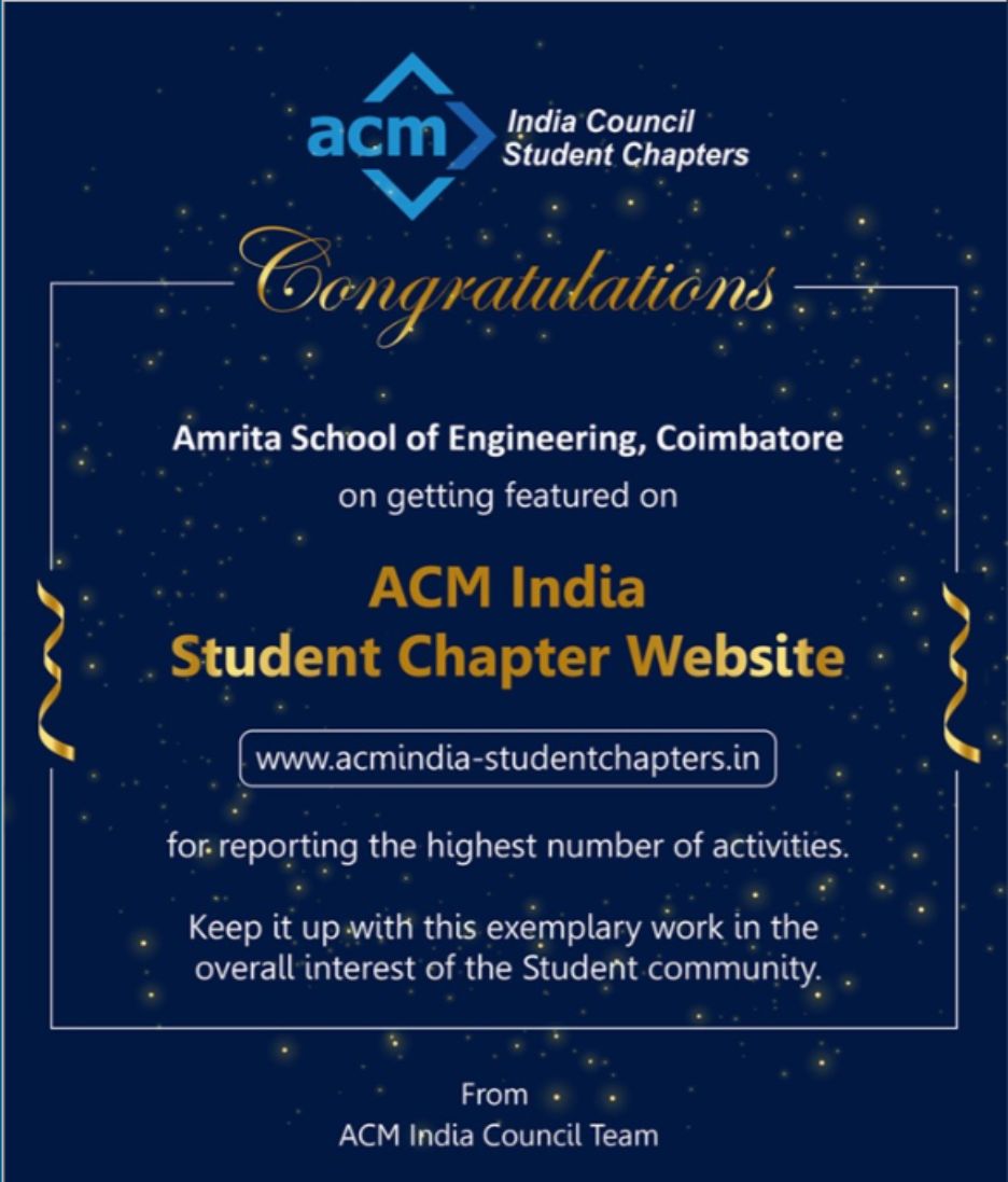 Amrita School of Engineering/Coimbatore ACM Student Chapter was featured on the ‘ACM India Student Chapter Portal‘ on account of reporting the highest number of activities on the portal. Aadithyaa Eeswaran, Leela, Sanyam Bhardwaj, Sarath Chandra, and Adithya Menon R are the Office bearers of this chapter at Amrita School of Computing, Coimbatore. Ms. Bindu K R and Dr Arti Anuragi are the Faculty Sponsors of this chapter. The ACM student chapter was launched on May 8, 2008. The ACM student chapter regularly conducts State-of-the-art workshops and hackathons.