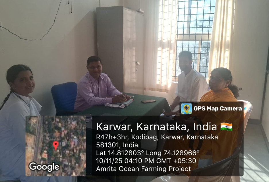 During the visit, the AMMACHI Labs team engaged with a diverse group of stakeholders, including coastal communities in Karwar and Mudga, marine biologists from Karnataka University, officials from Aajeevika – National Rural Livelihood Mission (NRLM), Fisheries Department representatives, and the CEO of the Zilla Panchayat. These discussions focused on identifying suitable coastal sites, understanding the local marine ecosystem, and evaluating interest among women’s Self Help Groups (SHGs) in adopting seaweed cultivation.