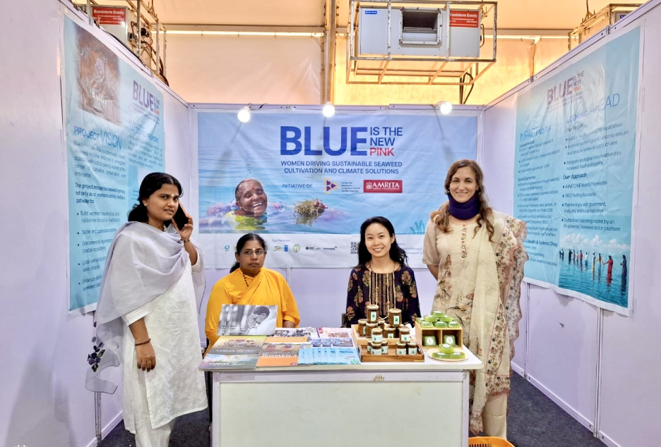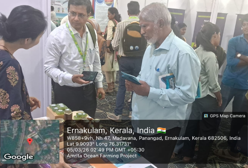 During the symposium held in Kochi, the AMMACHI Labs team hosted an exhibition booth presenting the “Blue is the New Pink” model, which highlights women-led seaweed cultivation initiatives and the development of value-added seaweed products. The display featured innovative products such as seaweed pickles and seaweed-based soaps produced by women entrepreneurs from Rameswaram.