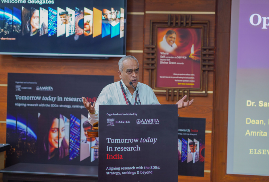 Amrita Vishwa Vidyapeetham co-hosted the 3rd edition of Elsevier’s national conclave, ‘Tomorrow Today in Research India 2025’, at its Coimbatore Campus on 13 November 2025. Over 60+ vice-chancellors, directors, deans, and heads from various universities across India attended the thought-provoking event that explored how institutions can drive sustainability, impact, and global competitiveness through research. With a focus on the UN Sustainable Development Goals (SDGs), this conclave brought together academic leaders, policymakers, and research professionals to discuss strategies for aligning research with societal priorities while strengthening institutional rankings and reputation.