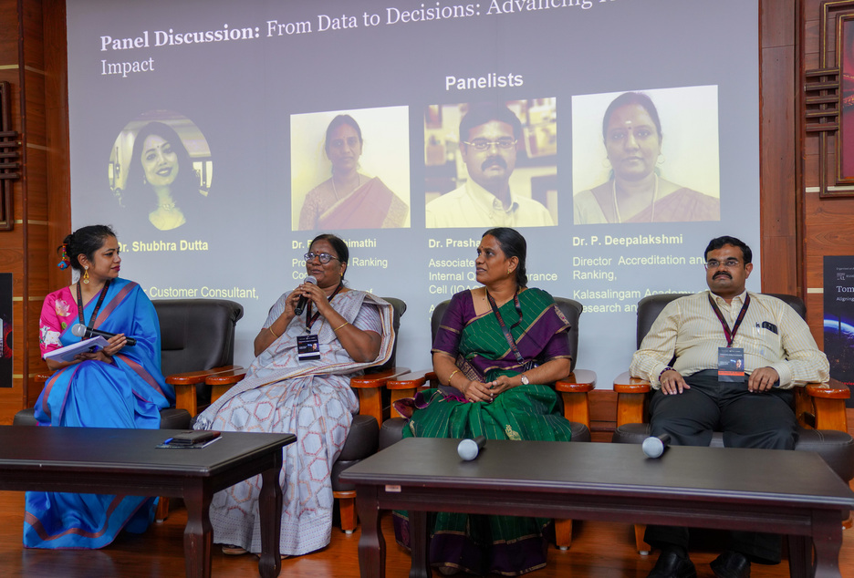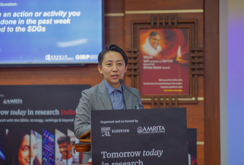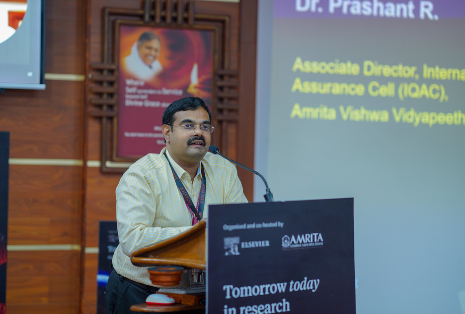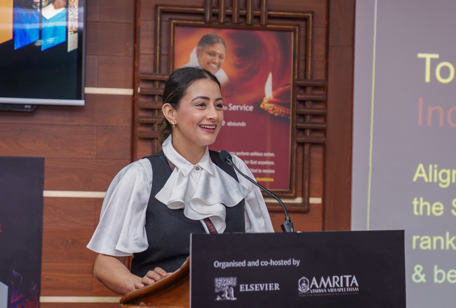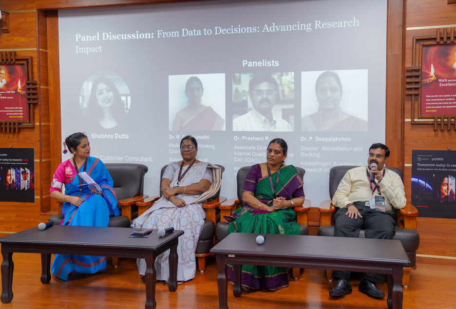 Dr. Jingwen Mu, Director of Institutional Research & Strategic Planning at Hong Kong Baptist University, as the international keynote speaker, shared her insights on how universities can leverage data and research intelligence to advance the SDGs. Dr. Maneesha V. Ramesh, Pro Vice-Chancellor, Amrita Vishwa Vidyapeetham, addressed the conclave on the theme, ‘Amrita’s Research Journey: From Rankings to SDG Impact’. She outlined the research strategies and best practices of the university as an aspirational example for other institutions. Dr. Maneesha also showcased the Live-in-Labs experiential program, conceptualized by Chancellor AMMA, as also highlighted its wide-ranging impact in terms of both societal and research outcomes. Dr. Sasangan Ramanathan, Dean-Academics, Amrita Vishwa Vidyapeetham, inaugurated the event and also delivered the opening remarks. Mr. Kavit Yagnik, Regional Director, Elsevier, welcomed the gathering. The event also hosted 2 panel discussions to exchange ideas, address challenges, and shape the future of sustainable research. An exclusive Elsevier SciVal Roadmap 2025 presentation was also part of the deliberations. Universities that participated included IIT Madras, IIT Patna, NIT Trichy, Manipal, VIT, SRM, SASTRA, Christ, ICFAI, OP Jindal Global, Satyabhama, Kalasalingam, Sri Ramachandra, Siksha ‘O’ Anusandhan, Centurion, Symbiosis, Vels, Karunya, Karpagam, Vinayaka Mission, Avinashilingam, and Indian School of Business. The conclave was coordinated by Dr. Prashant R. Nair, Associate Director-IQAC @ AMRITA, who also showcased AMRITA’s best practices in IQAC in the panel, ‘From Data to Decisions’.