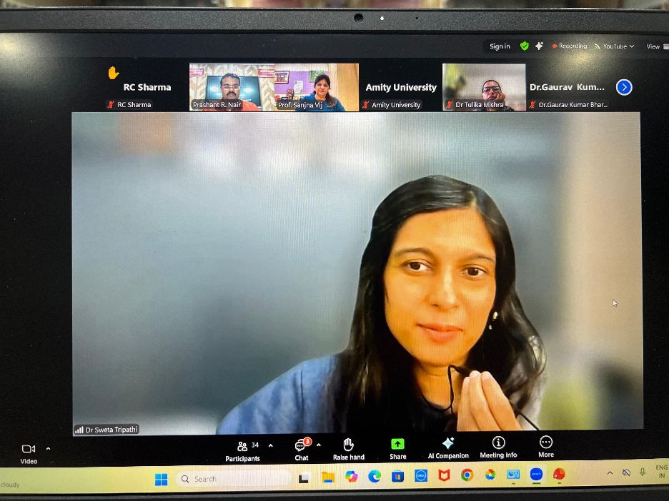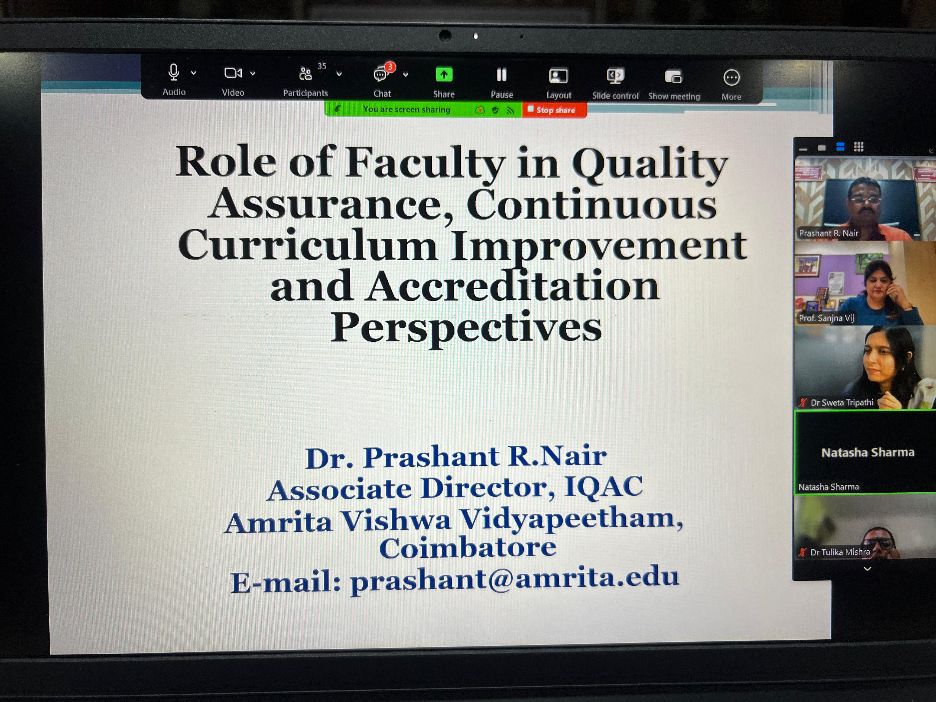 Dr. Prashant R. Nair, Associate Director, Internal Quality Assurance Cell (IQAC), Amrita Vishwa Vidyapeetham, Coimbatore spoke on the ‘Role of Faculty in Quality Assurance, Continuous Curriculum Improvement, and Accreditation Perspectives’ for a 5-day online Faculty Development Program (FDP) on ‘Synergizing Faculty Efforts to Advance OBE’ organized by the Academic Staff College (ASC) of Amity University, Haryana in association with the Association of Indian Universities (AIU) on 28 November 2025. 50+ faculty members from various higher educational institutions attended the session, which was presided over by Prof. Sanjna Vij, Deputy Director, ASC of Amity. This online FDP was inaugurated by Dr. T.G. Sitharam, Chairman of the All India Council for Technical Education (AICTE), Government of India. Dr. Prashant showcased Amrita Vishwa Vidyapeetham’s best practices, such as IQAC as a nodal office for rankings & accreditation, for the benefit of the participants.