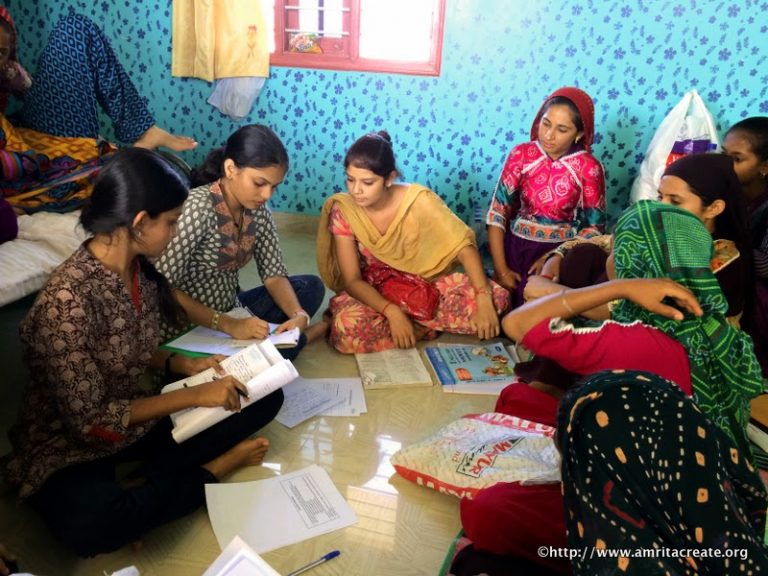 Rural education is stressed as a key area in the internship program. Under Amma’s guidance, Amrita-RITE (Rural India Tablet Education), the education wing of the Amrita SeRVe project, has developed a unique technology-driven educational program and teacher-training program for rural education based on tablets and hands-on methods, that motivate children to learn at their own pace. The students had received training and were given tablets through AmritaRITE to take with them to use in the tuition centres that have been set up in the villages. The tablets were used in tutoring and in promoting health and social awareness using special software developed at Amrita. Although there is a school in the vicinity of most villages, attendance is poor and the average student’s skills are many levels below class standards. But most of the children were quick learners. The ‘teaching-hands-on-Math’ training that the teams had been given before they set out for the villages came in handy even across language barriers.