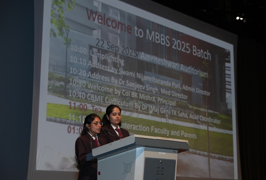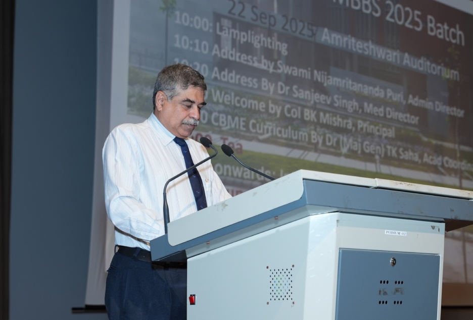 The Amrita School of Medicine, Faridabad, held a warm and engaging Orientation Program for the new MBBS Batch of 2025, welcoming both students and their families into the Amrita community. The event began with a traditional lamp-lighting ceremony, followed by inspiring addresses from Principal Dr. B.K. Mishra, Dr. Sanjeev Singh, and Dr. T.K. Saha (Maj Gen), who shared insights on the CBME curriculum, the five-year medical journey, and the values of responsibility, resilience, and compassionate service to humanity.