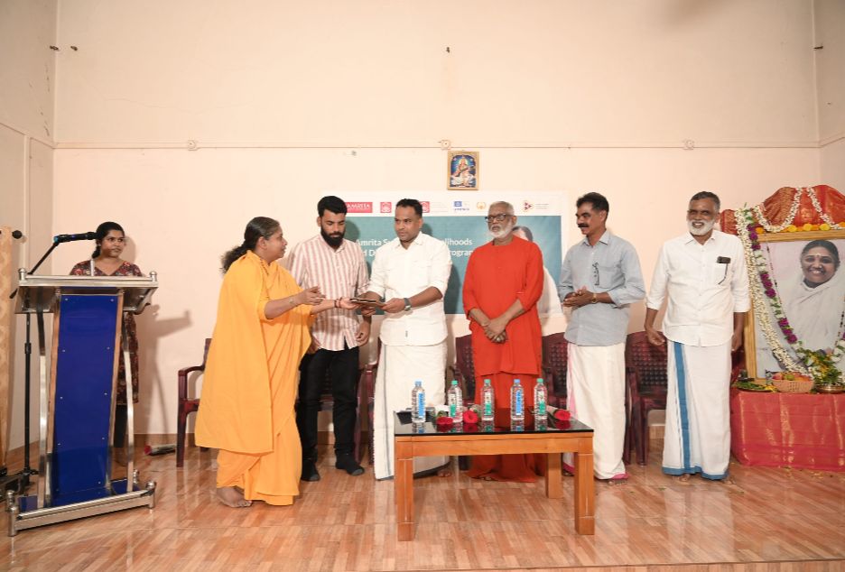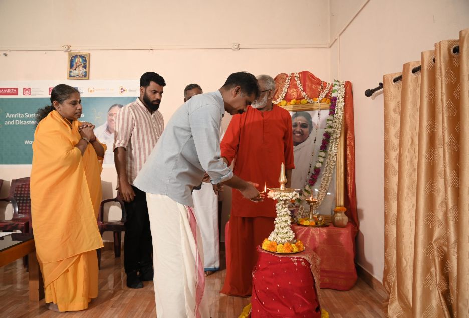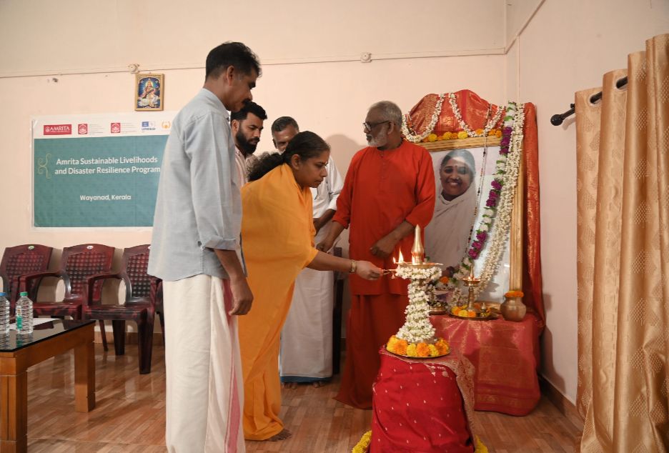 Amrita Sustainable Livelihood & Disaster Resilience Program inaugurated its new Skill Development Training Center at Mata Amritanandamayi Math, Meppadi, Wayanad. This initiative has been launched with a special focus on supporting the landslide-affected communities of Wayanad by equipping them with sustainable livelihood skills and creating new opportunities for self-reliance. The inauguration ceremony was graced by the presence of Mr. Samshad Maraikkar, District Panchayat President, who served as the Chief Guest, and was presided over by Sampoojya Swami Vedamritananda Puri, Abbot of Amma’s Meppadi Ashram. Meppadi Grama Panchayat President K. Babu and Ward Member Harris C also attended, extending their full support and encouragement to the program.