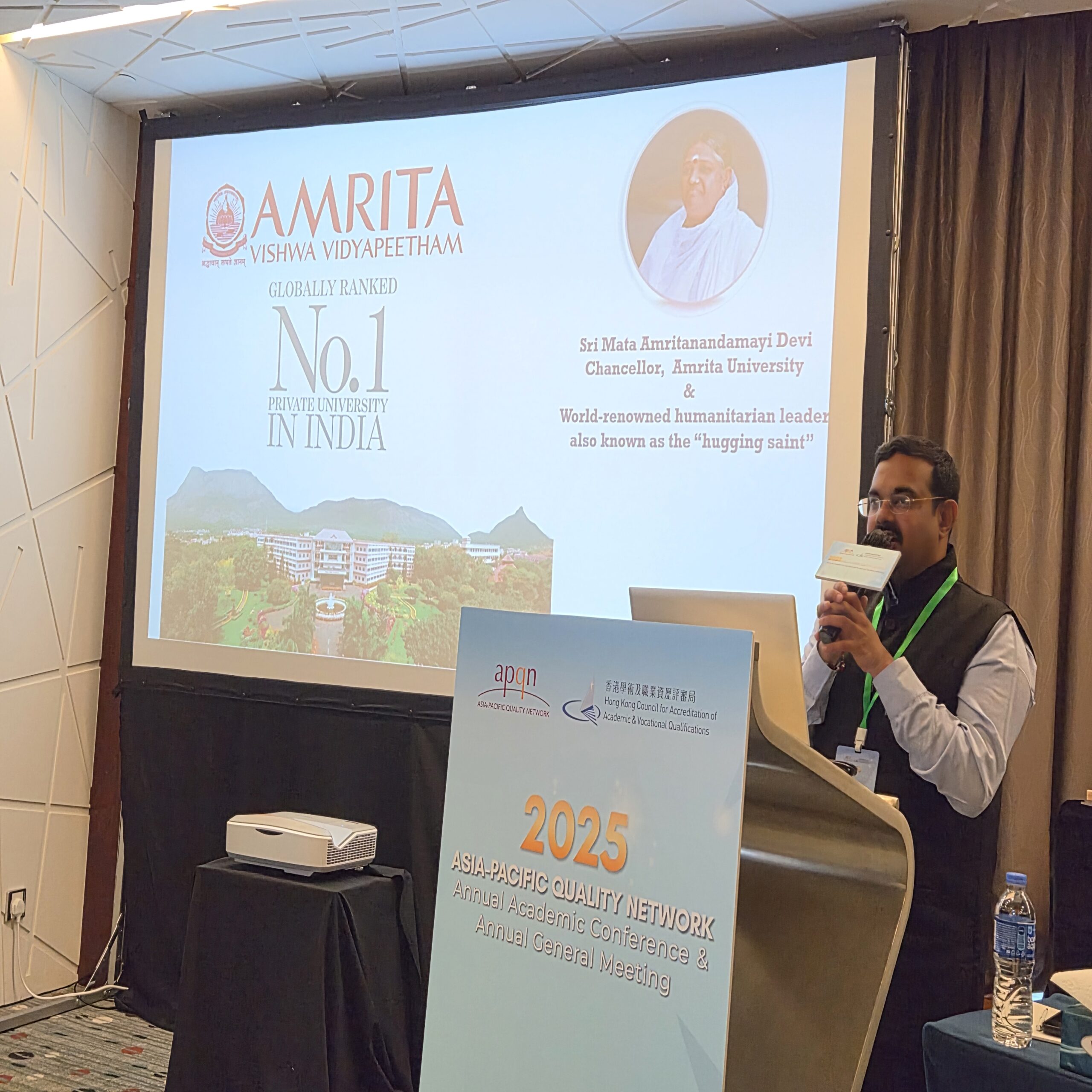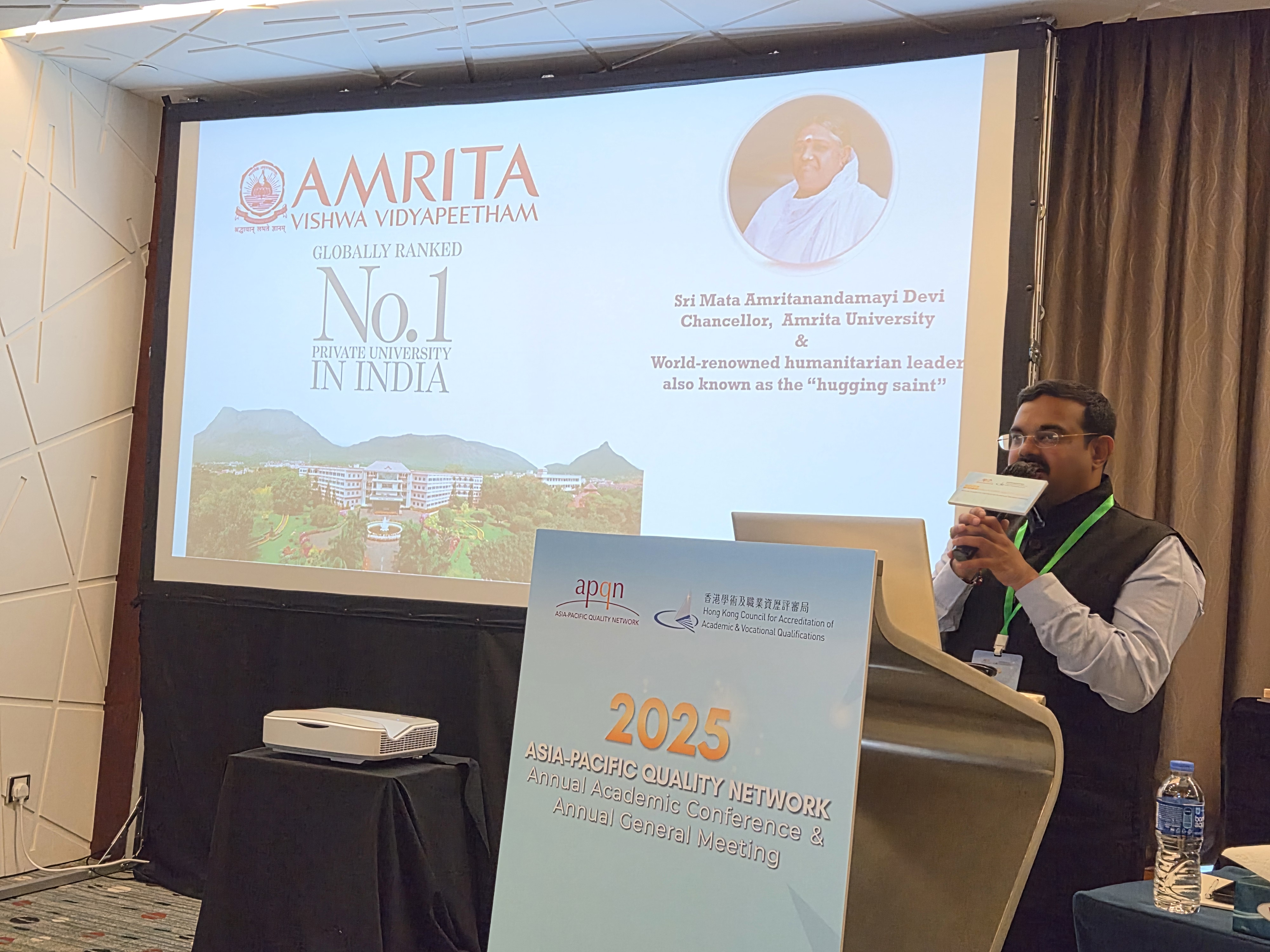 Dr. Prashant R. Nair, Associate Director – IQAC, Amrita Vishwa Vidyapeetham, showcased AMRITA’s Competitive Programming Initiatives and hosting of International Collegiate Programming Contest (ICPC) as a case study at Asia-Pacific Quality Network (APQN) Annual Academic Conference 2025 held at Hong Kong on 22 November 2025. There were only two presentations from India for the APQN 2025 conference, one from Amrita and another from the National Assessment and Accreditation Council (NAAC), which is the nodal accreditation agency representing India in the APQN. Founded in 2003, the APQN regional network has a membership base of 196 quality assurance agencies from 45 countries striving to enhance the quality of higher education in the Asia-Pacific Region.