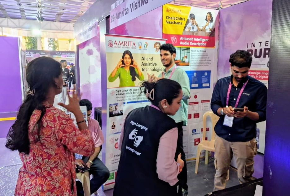 The projects are rooted in the ethos of compassion-driven research. Our approach of co-designing Assistive Technology (AT) with experts and Persons with Disabilities (PwD)—from design to deployment—sets the standard for equity, representation, and justice. Our project team—comprising signers Mr. Hisham CP and Mr. Nikhil Das, and ISL interpreter Mr. Rajeevan Koliyate—confidently presented the AI-powered ISL chatbot at the exhibition booth.
