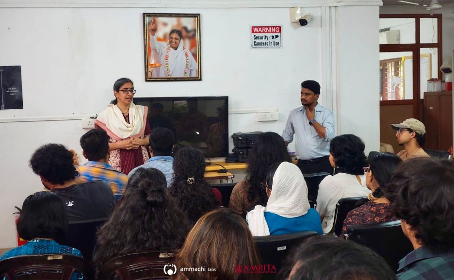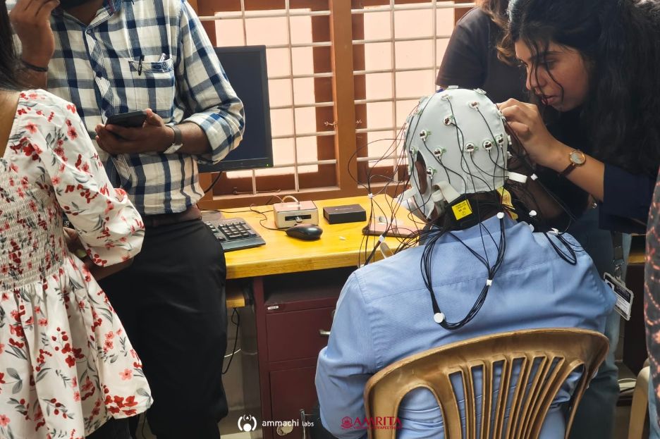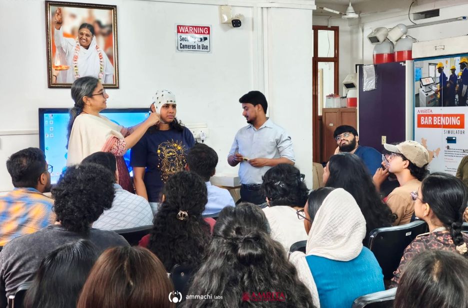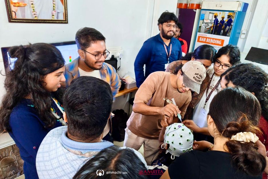 Students at Amrita Vishwa Vidyapeetham’s Amritapuri campus gained valuable practical exposure to advanced neuroscience technologies during a one-day hands-on EEG workshop organized by AMMACHI Labs. The session was conducted for 26 Semester 2 students from the Cognitive Science and Learning Technology (CSLT) Master’s programme, along with several PhD scholars.