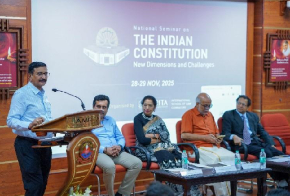 Amrita International School of Law (AISL) conducted a significant and stirring program titled Azadi ka Samvidhan: Tradition Inspiring Transformation to celebrate the 75th Constitution Day on 26 November 2025. The distinguished guests, together with faculty members and students, joined hands for a reflective talk on India’s constitutional heritage and its everlasting relevance in shaping the nation’s future.