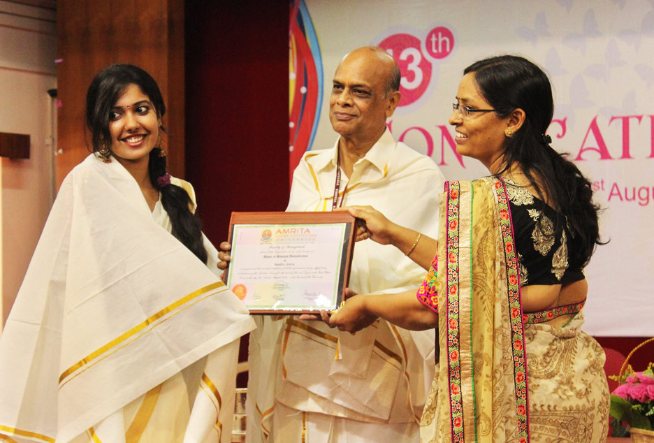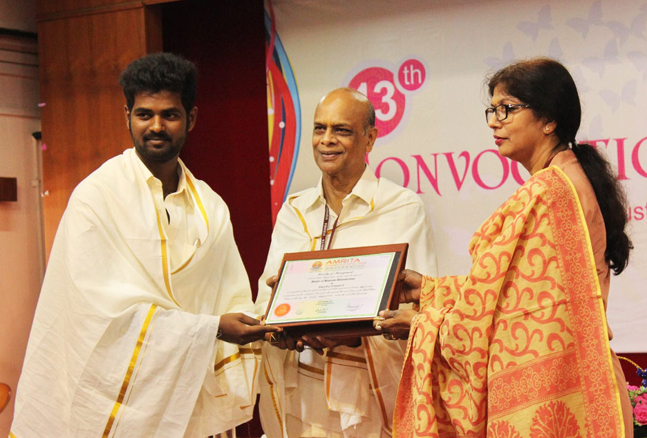 The 13th convocation of Amrita School of Business, Coimbatore was held on 21 August 2016. On the occasion, MBA and Ph.D. degrees were conferred upon 74 students from Class of 2016.