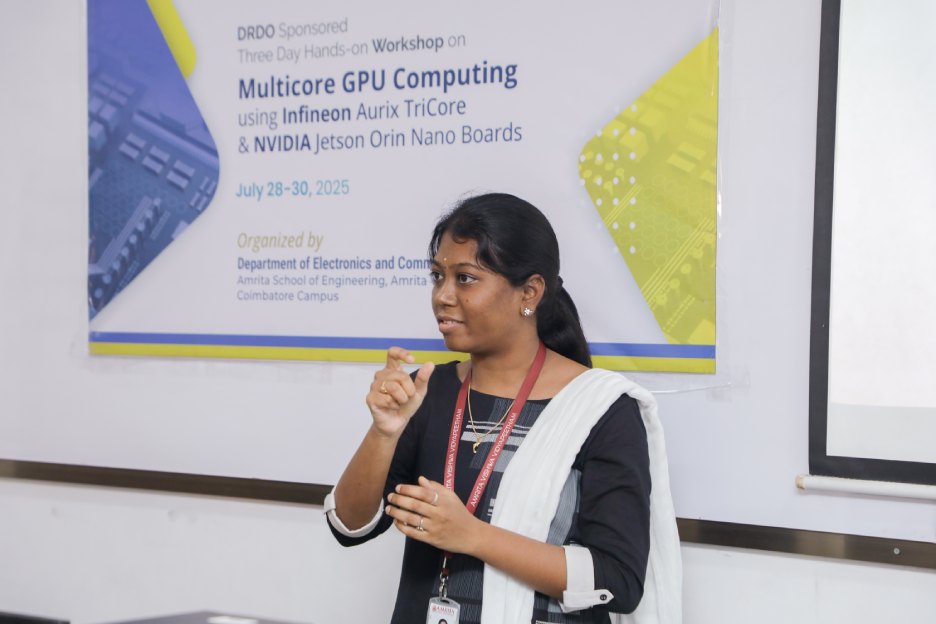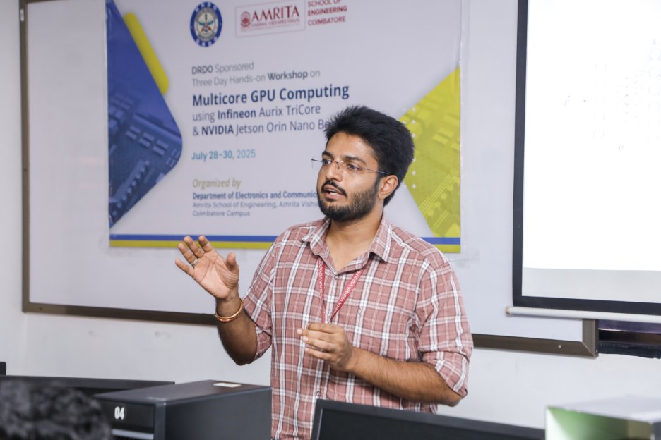 The Department of Electronics and Communication Engineering at Amrita Vishwa Vidyapeetham, Coimbatore Campus, conducted a three-day Advanced Hands-on Workshop on Multicore GPU Computing using Infineon AURIX TriCore and NVIDIA Jetson Orin Nano development boards. The workshop, sponsored by DRDO, was led by Dr. Ramanathan R and Shri Peeyush K P, aiming to build technical expertise in high-performance computing for applications spanning defense, autonomous systems, and intelligent automation.