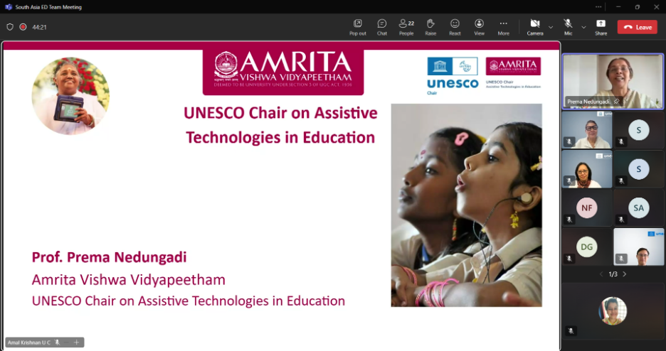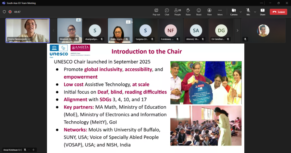 The UNESCO Regional Office for South Asia organized monthly Education Sector meetings that brought together colleagues from field offices across the region. The area of focus and theme for the month of October was Assistive Technologies, Disability Inclusion, and Inclusive Education on 14 October 2025. The meeting was chaired by Ms. Joyce Poan, Programme Specialist and Chief of Education, UNESCO Regional Office in New Delhi, and Ms. Huma Masood, Senior Gender Specialist, UNESCO.
