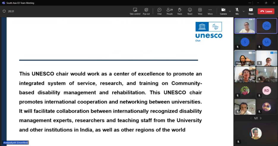 Three UNESCO Chairs on Assistive Technologies in Education, Amrita Vishwa Vidyapeetham, Community-based Disability Management and Rehabilitation Studies, University of Calicut; and Inclusive Adapted Physical Education and Yoga, Ramakrishna Mission Vivekananda Educational and Research Institute (RKMVERI) presented their insights, achievements, and recent developments from Chair’s work in these areas.