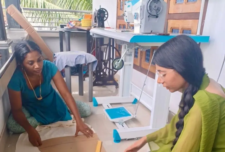 Recently, Muskan collaborated with Suma Lakshmi, a graduate of the Amrita Vishwakarma tailoring program, as Suma transitioned to using a power sewing machine—a gift from her husband, inspired by her enthusiasm and dedication after completing the course. Facilitating communication and coordination throughout this process was Gayathry Srinivasan, Business Development and Artisan Outreach lead at The WE Project Store.