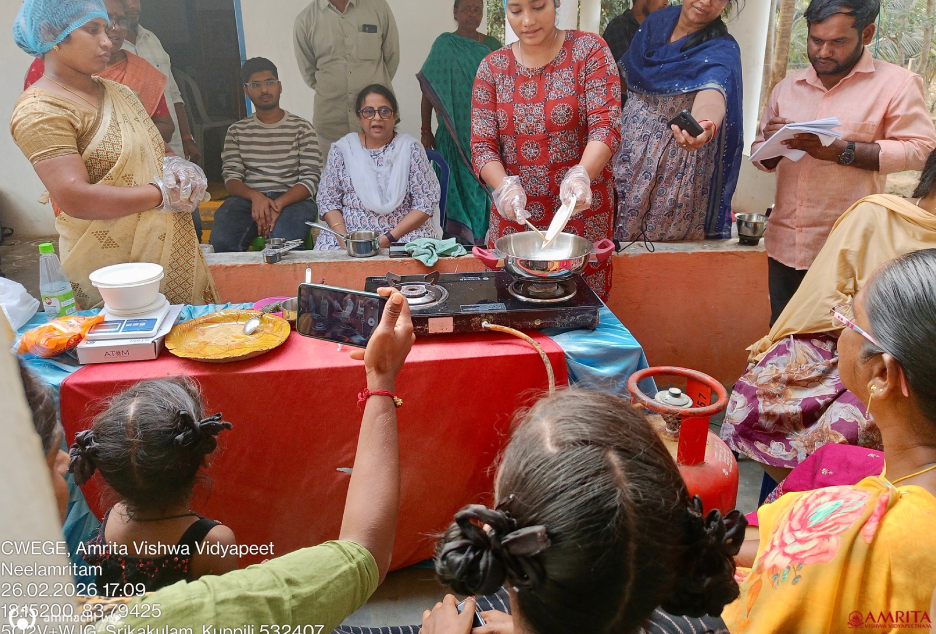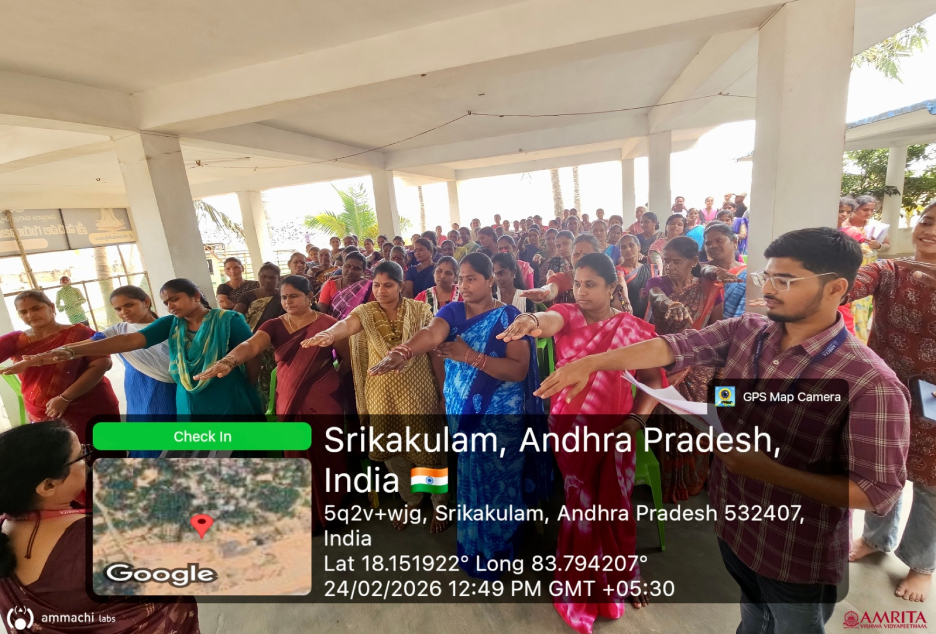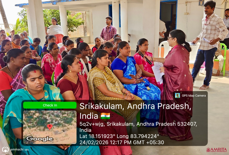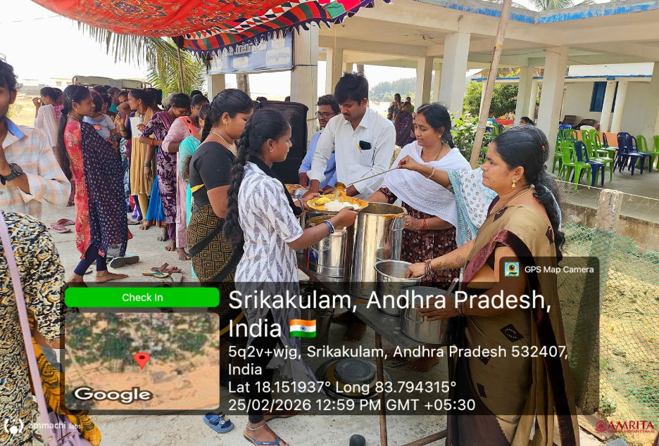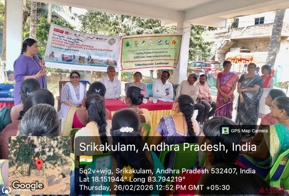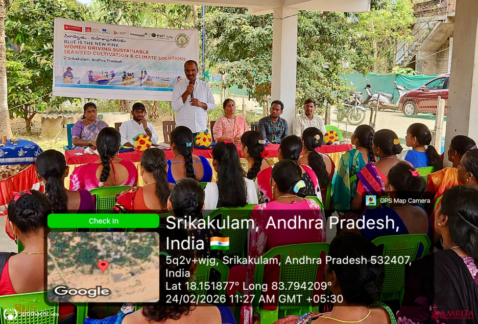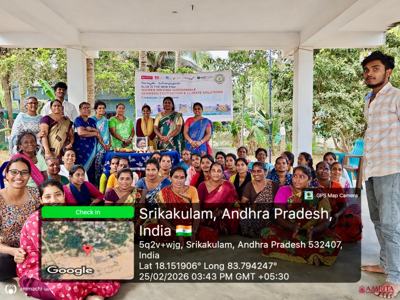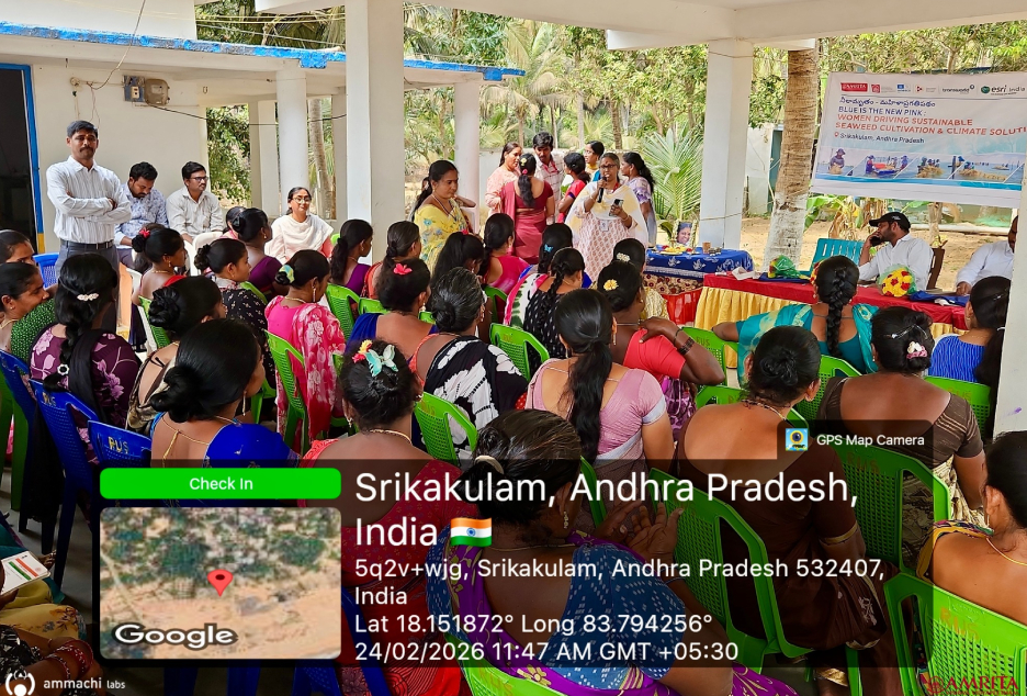 Budagatlapalem Village, Andhra Pradesh | February 24–26, 2026 : AMMACHI Labs recently organized “Mahila Utsavams – Neelamritam: Mahila Pragati Patham” (“Blue Nectar – A Pathway for Women’s Progress”) in Budagatlapalem village, Andhra Pradesh, bringing together women from coastal fishing communities to explore new livelihood opportunities through seaweed cultivation and value-added enterprises.
