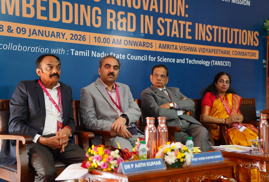 Dr. Maneesha Vinodini Ramesh, our Pro-Vice Chancellor underscored the critical role of universities in cultivating robust and sustainable R&D ecosystems. Prof. Dr. S. Vincent, Member Secretary, TNSCST, highlighted the need for coordinated state-level science and technology initiatives and Prof. Vivek Kumar Singh, Senior Adviser, Science & Technology, NITI Aayog, emphasized the importance of integrating research and innovation into state institutions to strengthen long-term innovation