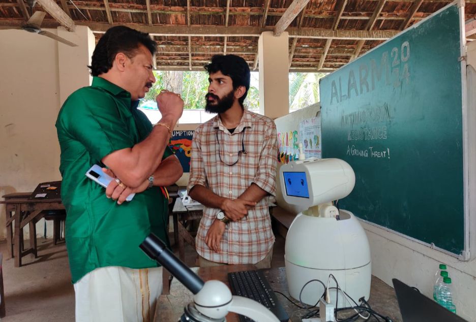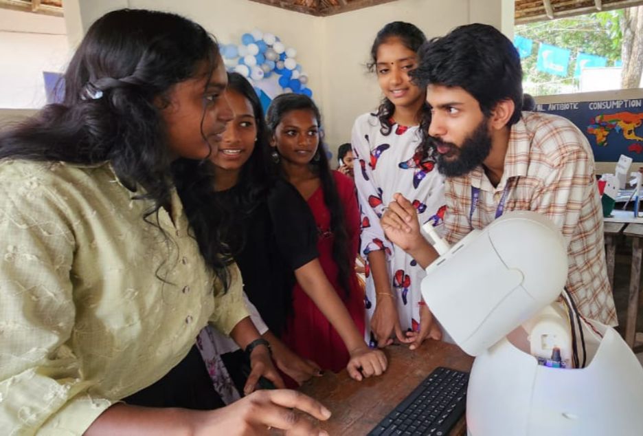 As part of the Amrita Legion for Antimicrobial Resistance Management (ALARM 2024) conference organized by the Amrita School of Biotechnology at Amritapuri Campus, AMMACHI Labs’ AI-powered social robot Haksh-E played a central role in the community outreach campaign. The event extended beyond academic discussions and reached into the local community through an awareness program at the Youth Festival hosted at SVHSS Clappana School from November 18th to 21st, which saw enthusiastic participation from nearly 500 students, 100 parents, and 50 teachers.