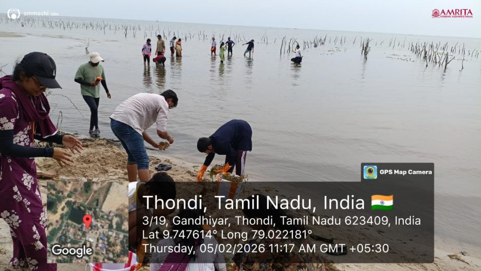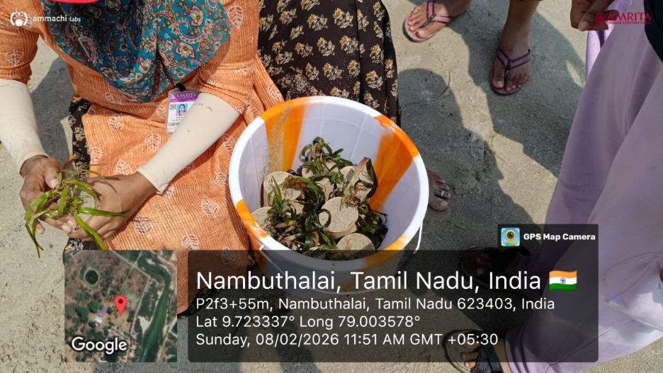 Over the course of the week, large-scale seagrass restoration was successfully implemented with active participation from MSW and BSW students of Amrita University (Amrita MSW Coimbatore) and women from local coastal communities. Healthy Cymodocea seagrass shoots were carefully planted across extended seabed areas using biodegradable cocopeat pots. This eco-friendly approach is expected to strengthen marine biodiversity while contributing to long-term coastal resilience.