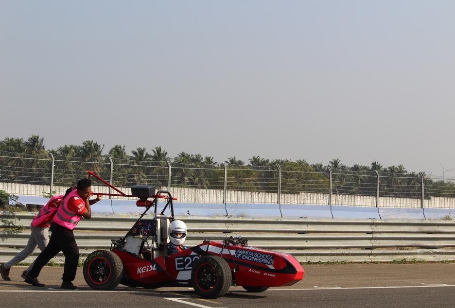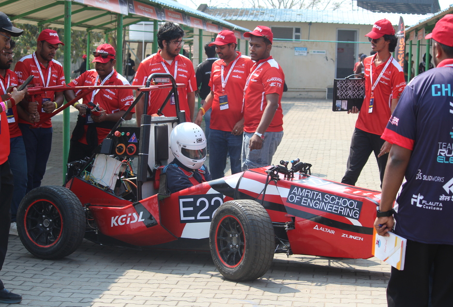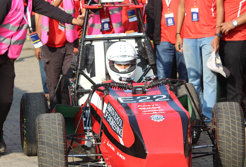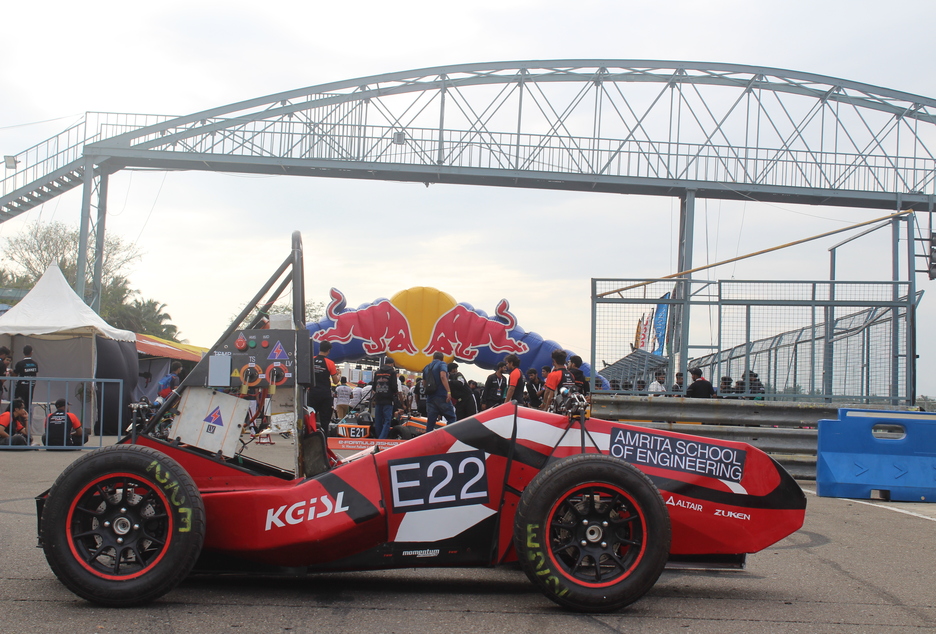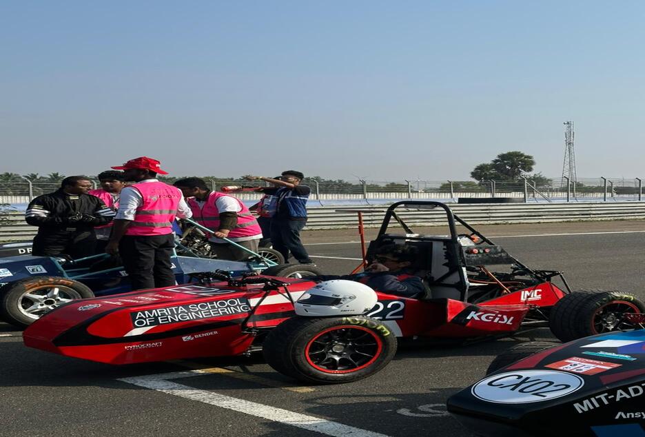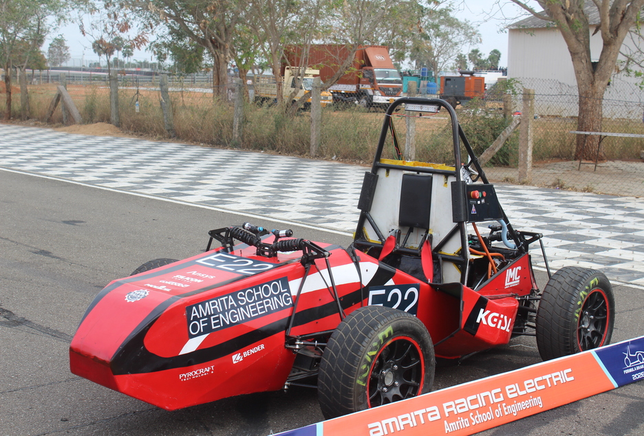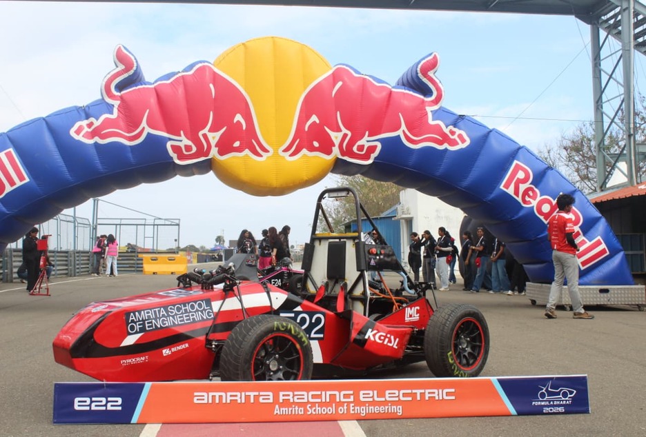 Team Amrita Racing, from the SAEINDIA Collegiate Club of Amrita, Department of Mechanical Engineering, Amrita School of Engineering, Coimbatore, proudly marked a historic milestone by participating in Formula Bharat 2026 under the Electric Vehicle category, held at Kari Motor Speedway. Competing against teams from leading engineering institutions across the country, the 38-member student team successfully designed and built a fully electric formula-style race car from the ground up, showcasing innovation, strong technical competence, and teamwork.