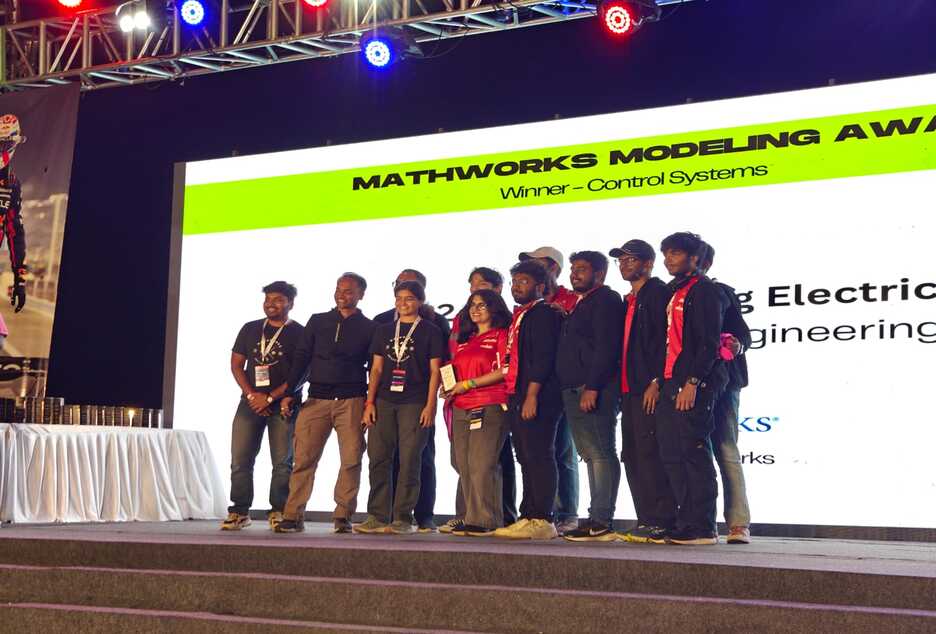 A major highlight of the team’s debut was winning the prestigious MATLAB–Simulink Award, recognizing excellence in system modeling, simulation accuracy, and control strategy development. The competition provided valuable exposure to electric powertrain integration, battery safety, vehicle dynamics, and real-world engineering problem-solving under strict technical regulations and timelines.
