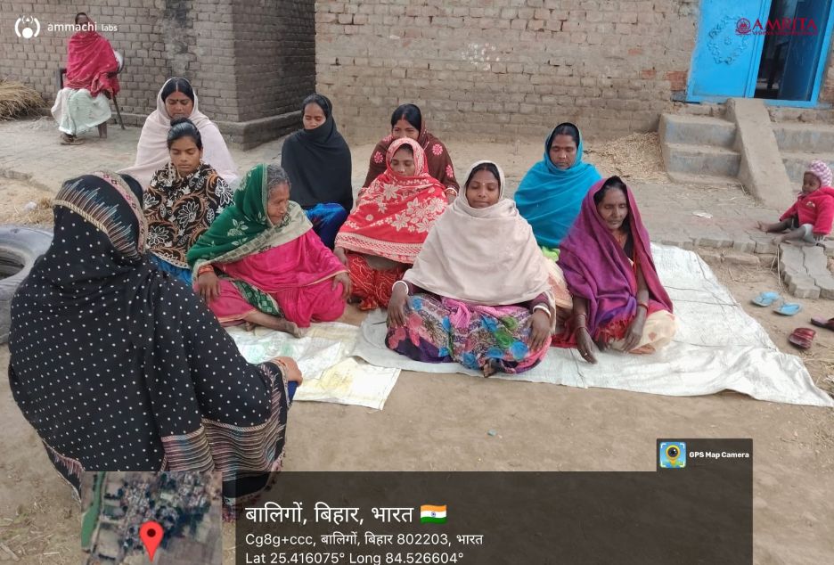 A On the occasion of World Meditation Day, a 30-minute guided audio meditation session was conducted across several Amrita SeRVe villages, bringing together women and children in a shared experience of calm, mindfulness, and reflection.
