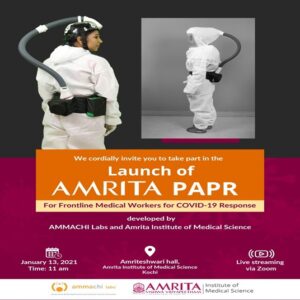 ‘Amrita PAPR’ has been officially launched and 20 devices have been handed over to AIMS Hospital for usage. In the coming weeks, AMMACHI Labs engineers and the doctors from AIMS are going to conduct the usability study and more rigorous testing of the device for further improvements and refinements, if required.