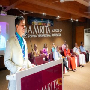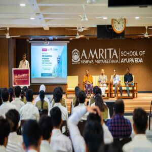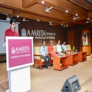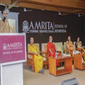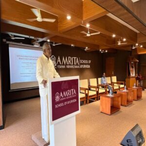 The event was graced by chief guests Dr. M R Vasudevan Nampoothiri, Former Principal and Former Director of Ayurveda Medical Education, Govt. of Kerala, and Dr. K Murali, Chief Editor, Centre for Textual Studies and Publications, Arya Vaidya Sala Kottakkal. They spoke on clinical insights and the scope of postgraduate studies. Br. Achyutamrita Chaitanya, Principal, Amrita School of Spiritual and Cultural Studies, offered felicitations.