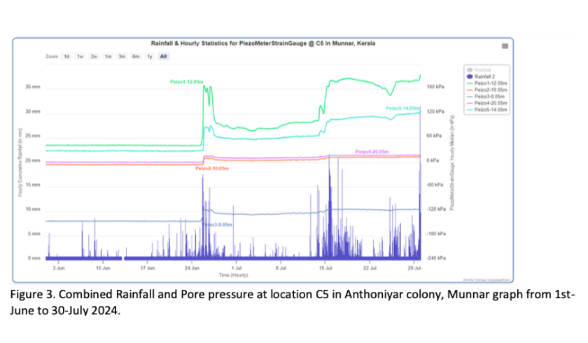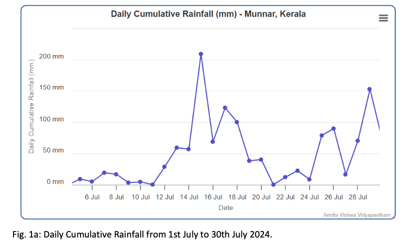 In June 2024, Amrita Vishwa Vidyapeetham actively informed and supported government authorities through its IoT-based Landslide Early Warning System (A-LEWS) deployed at Anthoniar Colony, Munnar, Idukki. The system, operational since 2009 with 150+ geological sensors and six Intelligent Wireless Probes recorded rainfall intensities and cumulative thresholds exceeding landslide-trigger levels, including 287.7 mm of rainfall over seven days and peak intensities of 51.6 mm/hour on 25 June 2024. Based on real-time monitoring, threshold analysis, and alignment with IMD’s heavy rainfall forecasts, Amrita formally notified authorities of the elevated risk of soil slips and landslidesacross vulnerable zones in the Munnar region, enabling early preparedness, monitoring, and risk-informed decision-making.