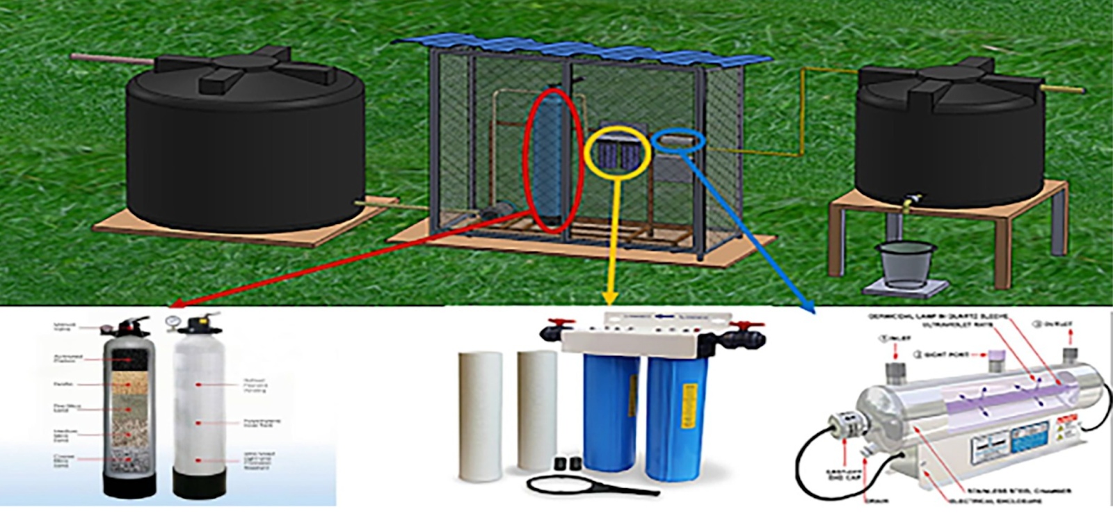 The filtered-water tanks are integrated with taps to provide drinking water at the location of the system. constituted of four levels of purification (i) a dual-medium activated carbon and four layers of marble crushed sand to reduce excess chlorine and turbidity from the water, (ii) a five micron filter (iii) a one micron filter for removing suspended particles and bacteria larger than 1 μm, and (iv) an ultraviolet (UV) lamp for disinfection from pathogens such as bacteria, viruses, etc. The remaining bacteria after the micron level filtration were disinfected using the UV lamp to ensure the safety of drinking water.
