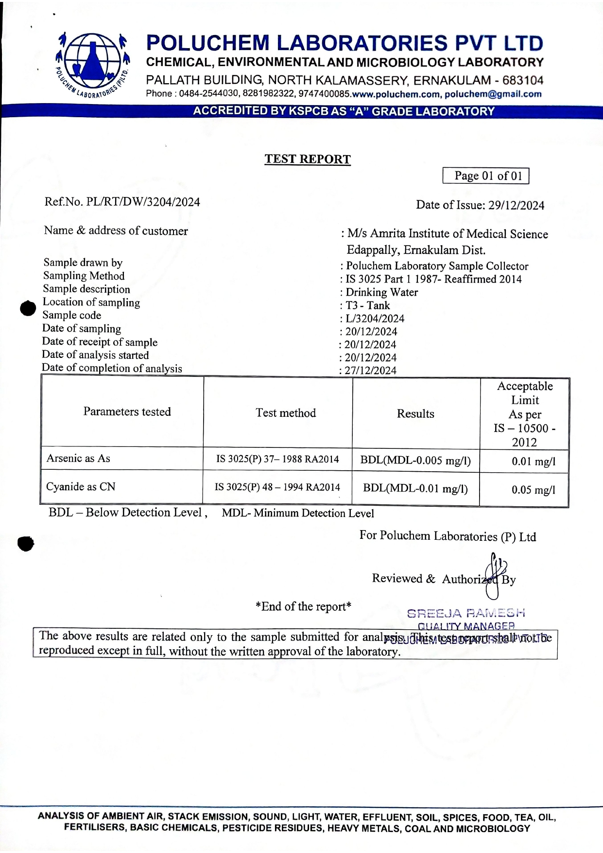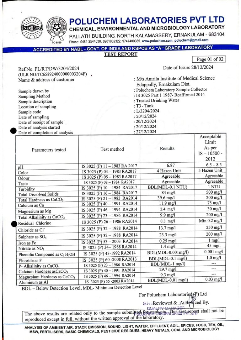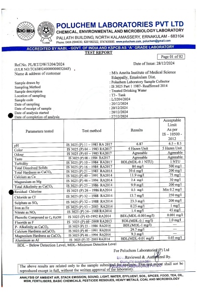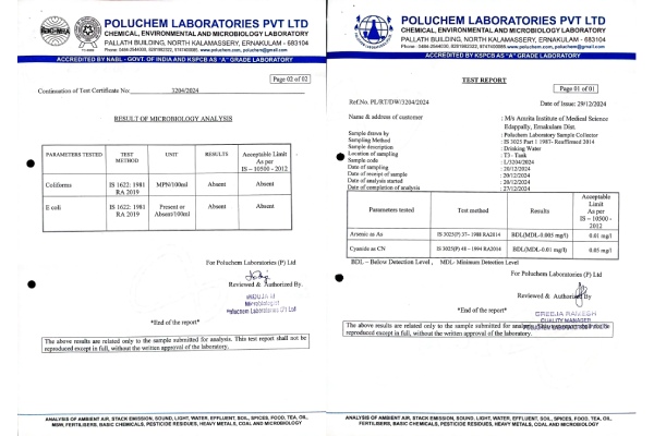 Across all campuses, Amrita Vishwa Vidyapeetham ensures that free drinking water meets national safety standards through regular testing by NABL-accredited laboratories. Comprehensive physico-chemical, heavy-metal, and microbiological analyses confirm that all parameters—including pH, turbidity, TDS, hardness, chlorine levels, sulphates, nitrates, and trace metals such as arsenic and cyanide—remain within the permissible limits of IS 10500:2012. Microbiological tests consistently report zero coliforms and zero E. coli, ensuring complete bacteriological safety. These findings validate that Amrita provides clean, safe, and fully compliant drinking water to students, staff, and visitors through stringent monitoring and accredited laboratory verification.