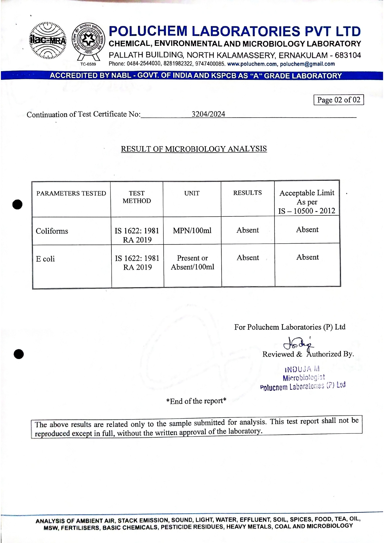 • Regular checks are carried out for parameters such as pH, turbidity, colour, chlorine content, total dissolved solids, taste & odour, and coliform presence, all maintained within acceptable regulatory standards.