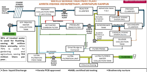 Amrita Vishwa Vidyapeetham is committed to sustainable water management, particularly in wastewater treatment and pollution prevention. The university operates several Sewage Treatment Plants (STPs) with a combined capacity of 1400 cubic meters per day, utilizing aerobic treatment methods and activated sludge mechanisms. Over the past three years, these plants have treated approximately 1,300 cubic meters of sewage water per day, which is then recycled for toilet flushing, arboriculture, and gardening, significantly contributing to freshwater conservation and maintaining a green environment on campus.