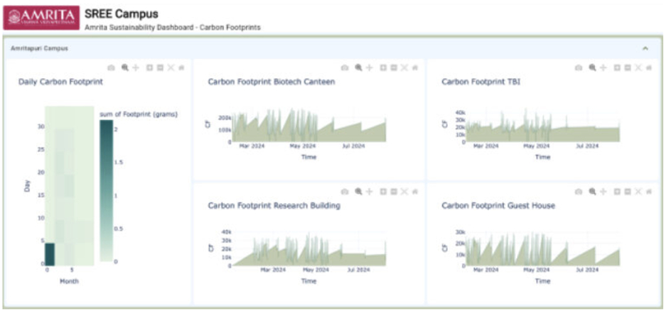 Amrita University has developed SREE (Sustainability & Resilience for Community Engagement & Empowerment) Campus, an advanced dashboard that monitors real-time sustainability performance across all campuses. The system tracks energy efficiency, climate conditions, and carbon emissions, providing live CO₂ data from electricity, heating, and cooling systems while enabling historical analysis to assess the impact of efficiency measures. SREE highlights the carbon intensity of different energy sources, supports low-carbon procurement decisions, and generates detailed emissions reports for compliance and sustainability reporting. By integrating data from multiple systems, the platform facilitates optimized resource management and informed decision-making.