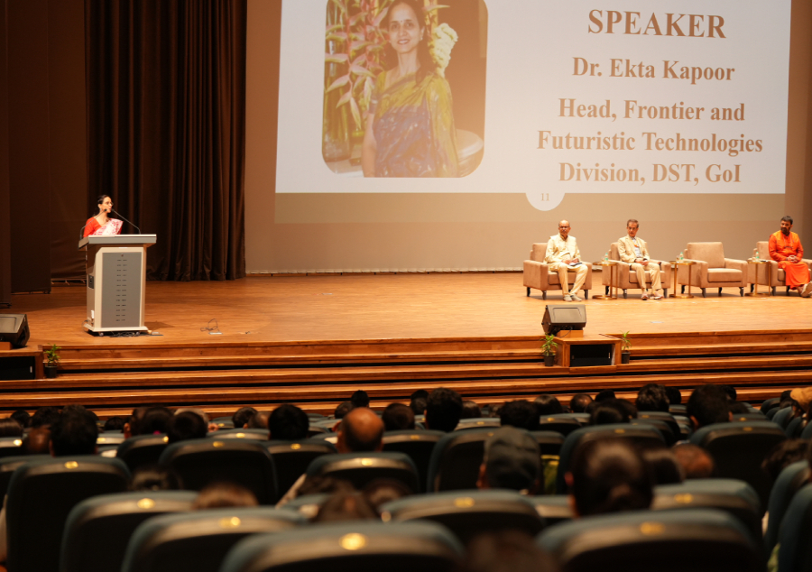 Dr. Ekta Kapoor delivering a seminar at Amrita Vishwa Vidyapeetham auditorium during an academic event.