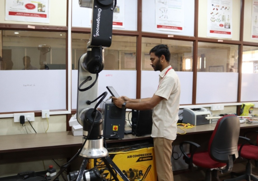 A man operates a robotic arm device in a technical research lab at Amrita Vishwa Vidyapeetham, showcasing hands-on engineering equipment relevant to industry and energy efficiency research.