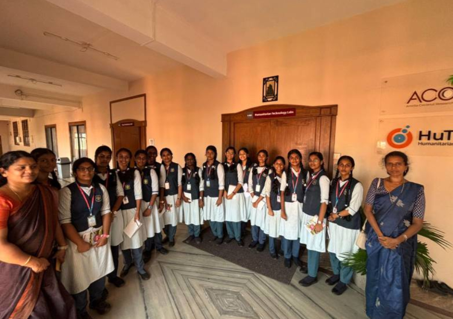 Students and faculty standing in front of the Foundation Technology Labs at Amrita Vishwa Vidyapeetham campus, highlighting engagement with innovative technology and education.