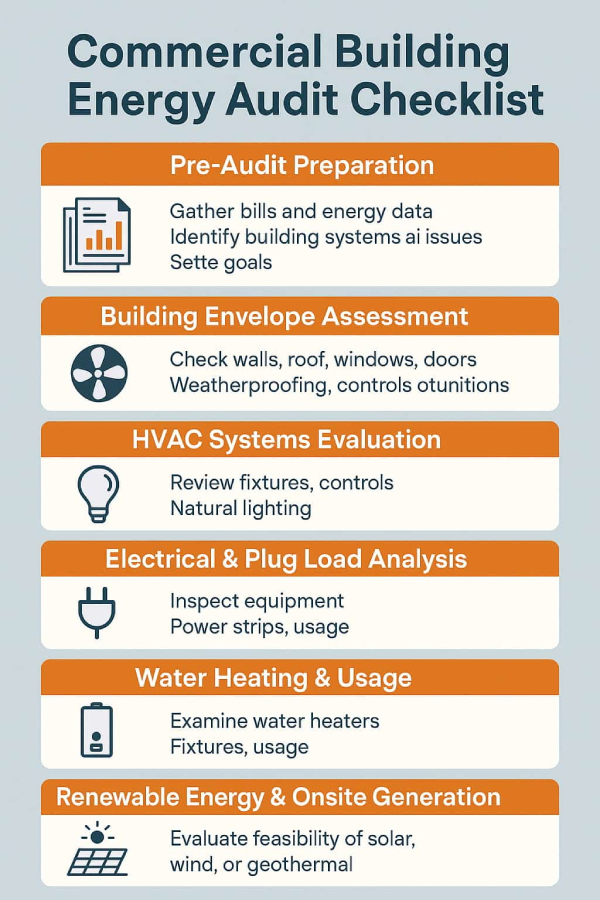Commercial building energy audit checklist outlining steps for evaluating energy use and identifying waste areas.