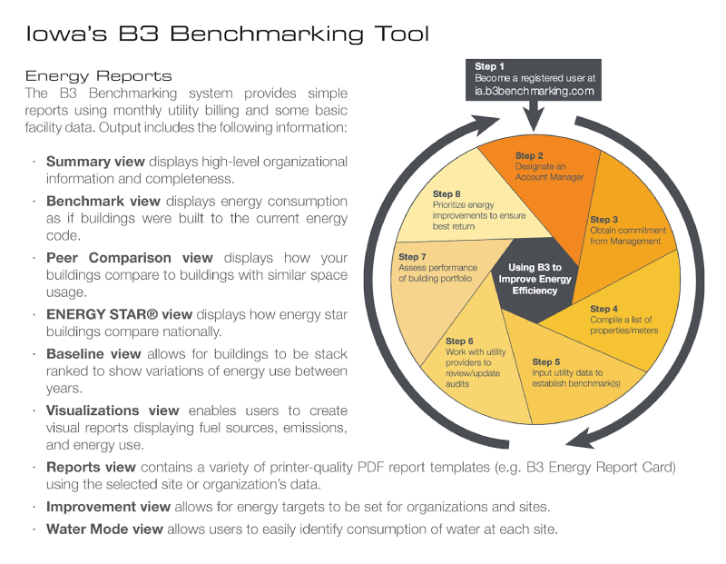 Iowa’s B3 Benchmarking Tool outlines an 8-step process for improving energy efficiency with various report views to analyze energy use and performance.