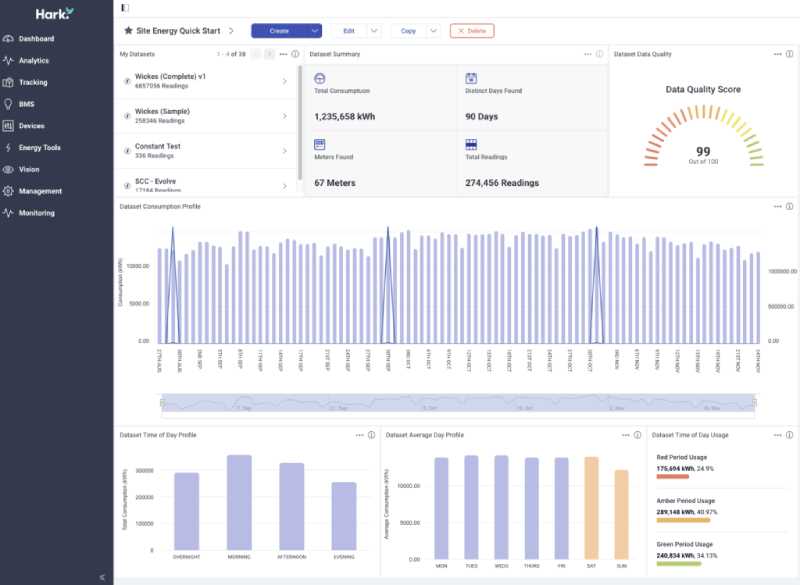 Energy and manufacturing dashboards showing comprehensive metrics for monitoring energy consumption, efficiency, conservation, and emissions over time.
