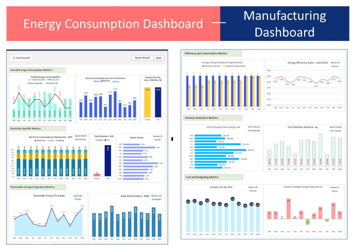 Energy and manufacturing dashboards showing comprehensive metrics for monitoring energy consumption, efficiency, conservation, and emissions over time.
