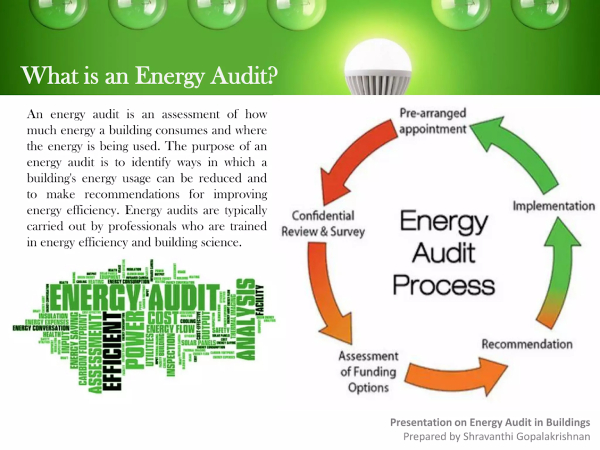 Diagram and explanation of the energy audit process for buildings to improve efficiency.