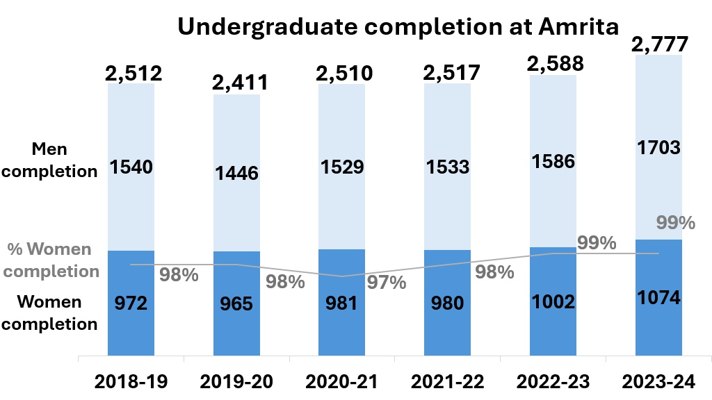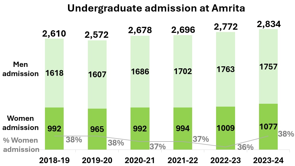 Amrita Vishwa Vidyapeetham is committed to gender diversity and helping women students succeed in their educational goals. Currently, 42% (+1% compared to last year) of the undergraduate student population is made up of women students.